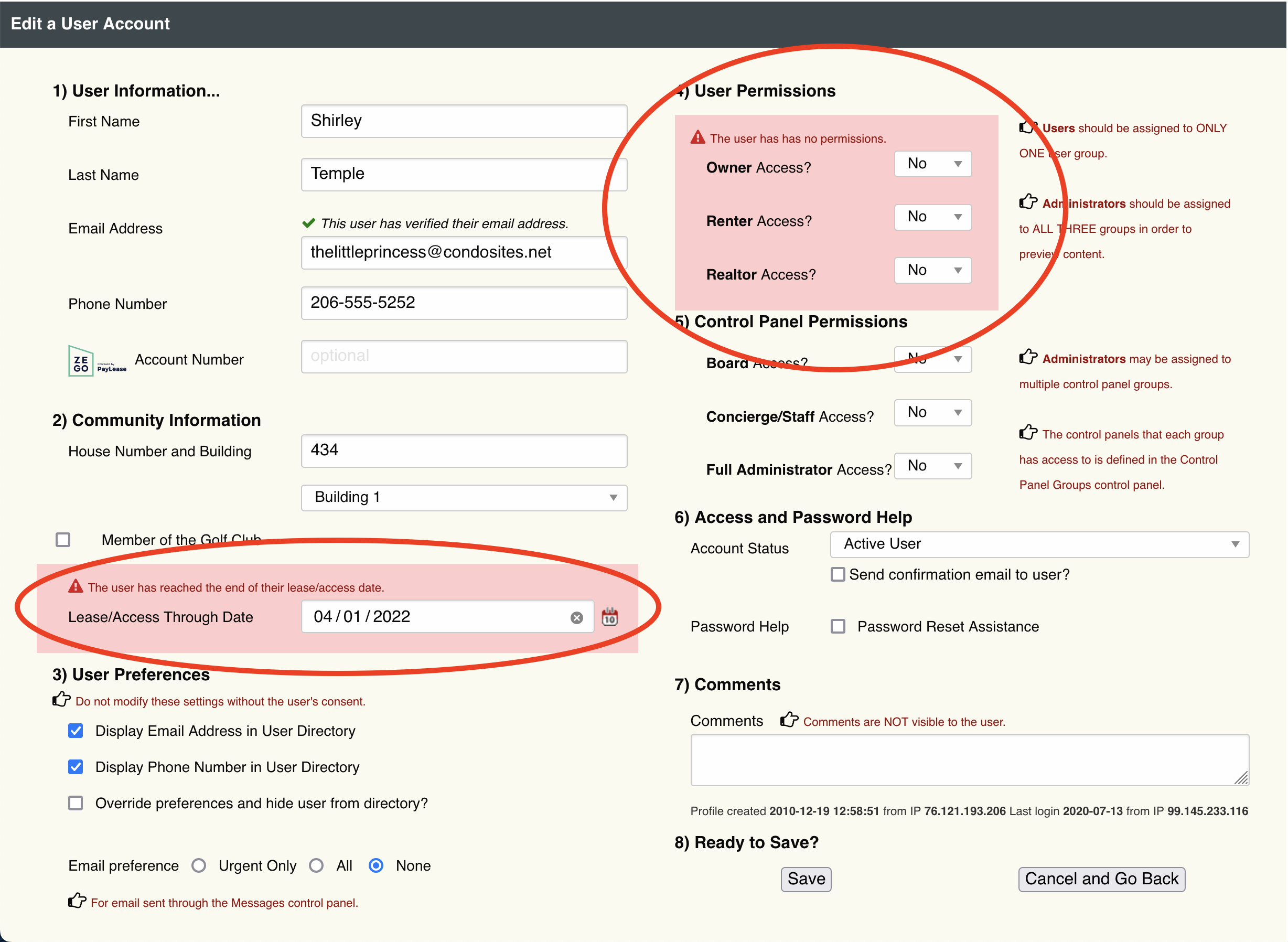 Any additional issues with the user account will be highlighted with a salmon red background on the edit screen of the User Accounts control panel.